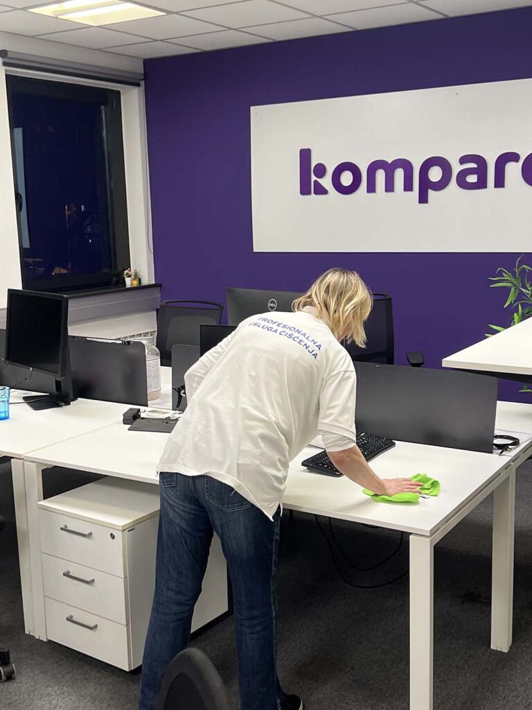 Plan i program čišćenja u potpunosti prilagođavamo Vama i Vašim potrebama, standardni paket uključuje dezinfekciju i čišćenje radnih površina, stolova, čajne kuhinje, sanitarnih čvorova, pranje podova, usisavanje tepisona itd.